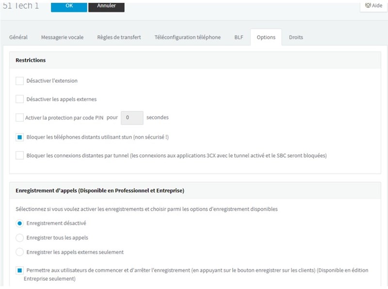 Cochez l'option que vous souhaitez entre enregistrer tous les appels et ou seulement les appels externes.